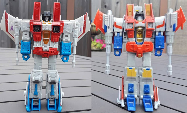 Now here he is next to Classics Starscream. Let's talk about the fact that they're not the same mold (and yes, this guy is supposed to be shorter than the Earthrise guy); first of all, the way the parts are molded doesn't really correlate with what the old toy had. The sculpted details do not match what was previously made, there are small crevices near the shoulder pylons where none were present on the Deluxe, the gray piece meant for the cockpit is not the same as the old Deluxe, the lower legs are molded differently, the shoulder pylons are more erect on the Voyager, and the torso's dimensions are different than on the Voyager. And the feet look better on the ER figure than on the Classics figure because they're not one piece of a foot that tries to use the thruster as a heel. Earthrise Starscream at least attempts to better distinguish himself from a Deluxe figure than Studio Series Starscream did from the DOTM Deluxe. Still, that figure feels like a new mold borrowing the engineering instead of being an upscaled Deluxe figure, so both figures are at least better figures in terms of adding new things beyond the size compared to Cybertron Supreme Starscream, who doesn't really add any improvements beyond the electronics and different weapon.