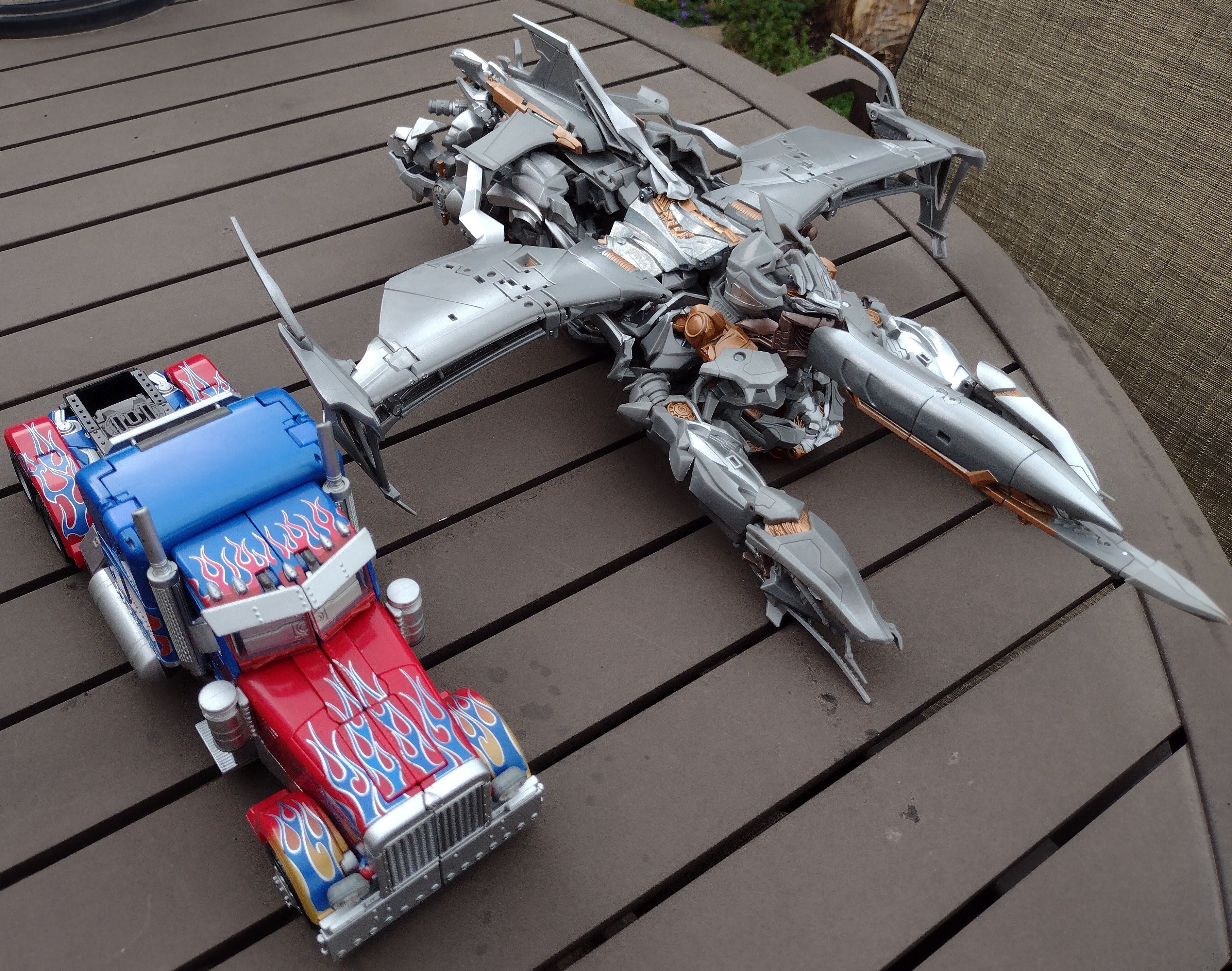 For a size comparison, who else but his enemy Optimus Prime? These two were great ways to contrast one another for their roles in the movie, with Optimus Prime being the friendly Autobot leader with his Earth form and a deco that shows his motivation towards burning the Decepticon tyranny down; Megatron, on the other hand, looks absolutely massive and eclipses over Optimus with his alien alt mode.