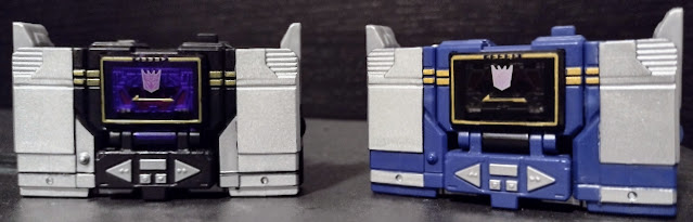 Here is Soundblaster in-hand next to Soundwave, with the main differences being that the gold is a darker shade now, the blue is replaced with black (though there is no break up on the side portions of the tapedeck mode like on Soundwave, and his chest not only has a purple tint but also has a clearer Decepticon insignia. He still retains the exposed toes in tape deck mode.