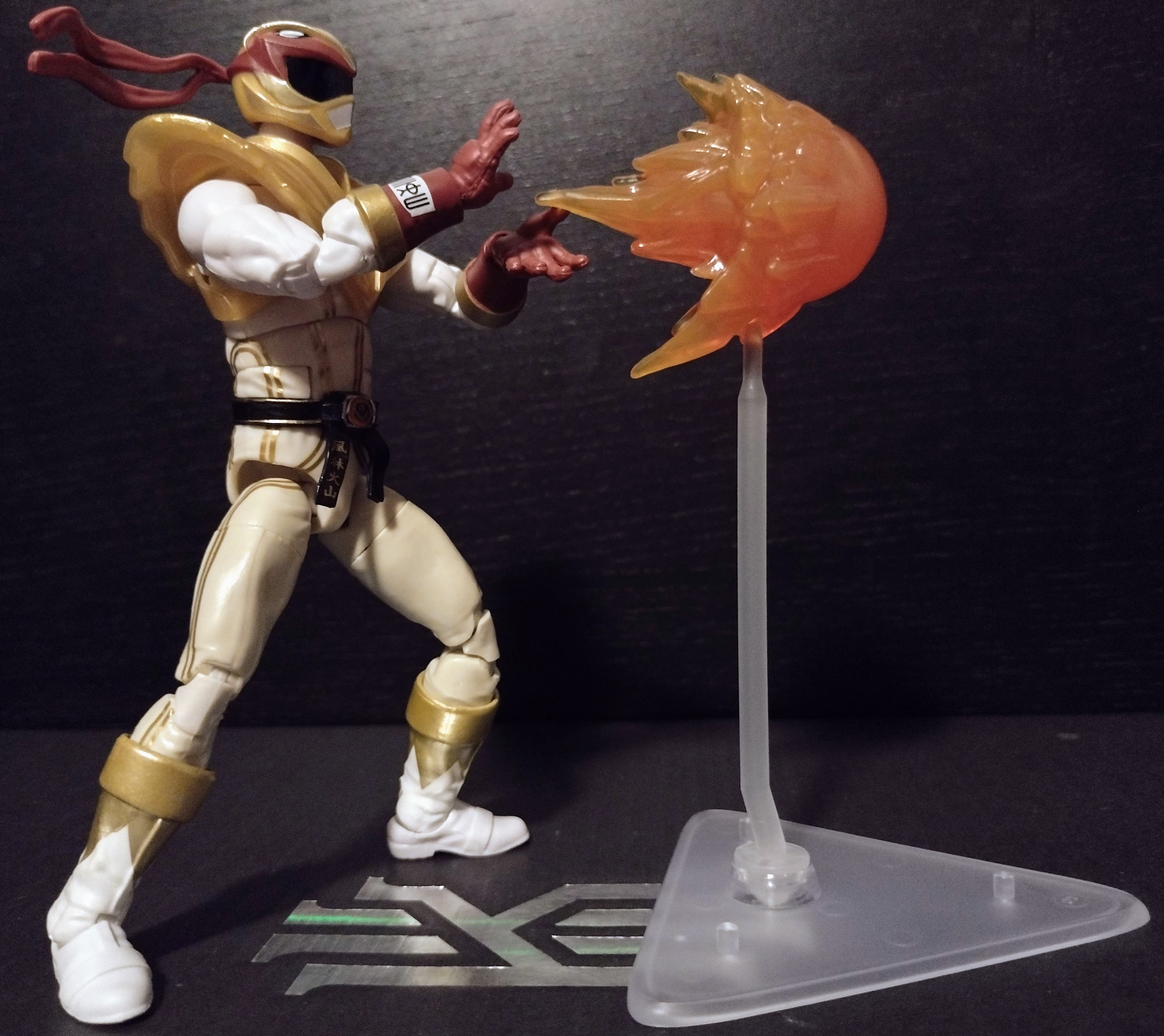 Head sculpt, apart from the gold paint apps ruining the visor, the helmet has quite a nice bit of personality to it that matches a bit of Chun-Li's half-serious, half-cheerful vibe. I like the influence of the Blazing Phoenix as the Ranger motif combined with the headgear she generally has in the series. But once again, we have a discrepancy between the gold on the visor border and the animal crest on the forehead. She, too, has the same approach to accessories fellow Street Fighter Ryu has; the base pieces are the same but the effect pieces are pretty cool. I also like that her hands are not the standard Ranger glove designs to better flow with her sleeves.