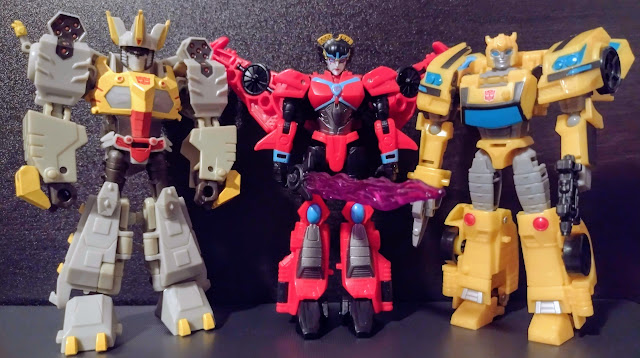 For a comparison with Starscream as well as our last Cyberverse addition, here she is sandwiched in-between the Seeker and Shadow Striker. While I prefer the ideas used on the purple Decepticon's design mashup, Windblade at least feels less awkward when it comes to proportions in addition to having more natural arm articulation. Both of them fit in decently with the otherwise simpler Cyberverse aesthetics.