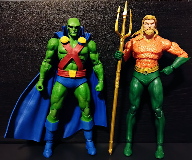 For a size comparison with Aquaman, if we assume Aquaman is 6'1" and Martian Manhunter 6'7", then the scale with these two is swapped. Even the figure Jon J'onzz was retooled from, Red Tornado, is not the right height. If we were to get an updated Martian Manhunter either from McFarlane or from Mattel (assuming they stay in the same scale), then making him better proportioned and taller than Aquaman should be a priority. That and making them both have more accessories than they currently do. Both figures are alright otherwise, but while Aquaman is pretty easy to get for cheap, the Martian Manhunter, being a Gold Label figure AND a classic design, will be difficult given the aftermarket value.