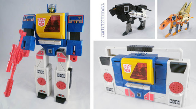 Here we have him alongside the others Decepticon Headmasters in their bot modes. Funny how two of them are retooled from 1987 Headmasters and one of them from a Monsterbot. It's also funny how we completed these three before we get a new Powerglide to scale with the current Minibots.