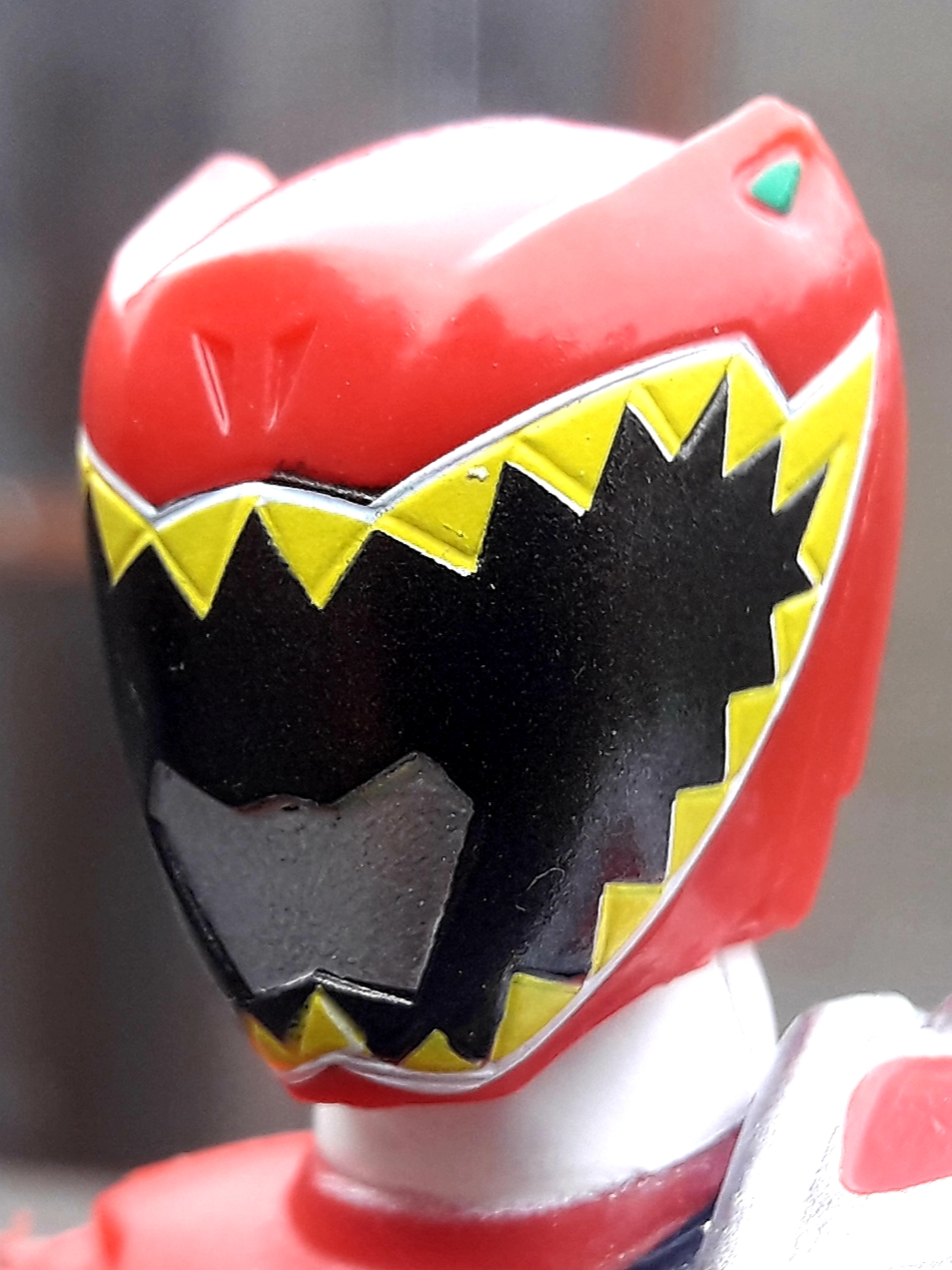 The helmet sculpt looks nicely done, yet my copy does suffer from the yellow parts of the teeth not quite lining up with the sculpted teeth when viewed up close. That's a shame, especially since the Hasbro quality control, while not always awful, could be slightly off at times. At least it's not missing anything crucial, as I've seen a small number of instances where the Beast Morphers Red Ranger is missing the silver paint for the mouthpiece, though if this was missing the silver mouthpiece, maybe it could double as Tyler acting like a T-Rex?