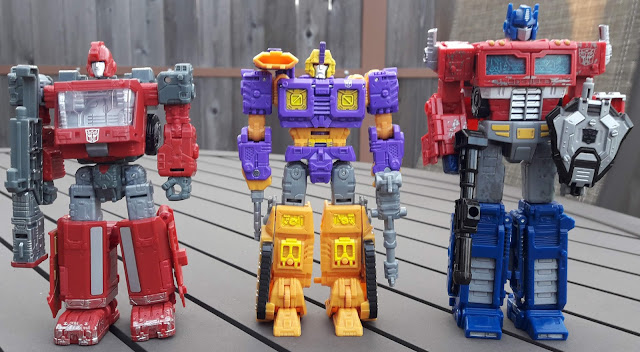 For a size comparison, here he is with said mostly goody-two-shoes Autobots Optimus Prime and Ironhide. Yeah, kind of funny to see some yellow and purple break up most of the red, gray, and blue (for Optimus) in this image. He's pretty much the same height as Ironhide, and it's so neat that Impactor's got a new mold of his own rather than share a mold with someone like Ironhide, because knowing the past, he would have easily been a reuse of Ironhide or Megatron.