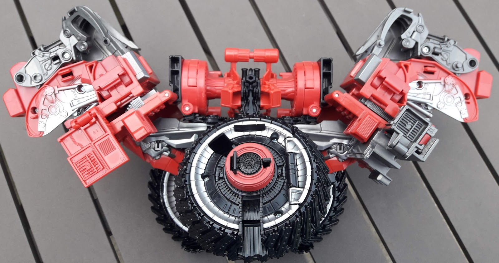 Transformation is pretty involved, which is expected given how his design works in the movies. There are a few things I like about it, such as folding up the treads of the bottom wheel and sandwiching them together, while the shoulders comprise of the vehicle mode folded up with the arms underneath it. I also like how the shell of most of the vehicle folds up to become shoulders while the shovel arm still splits into the arms. The upper wheel simply rotates to connect to two red pieces to complete the look of the wheel hanging over the head, even if there's a stem behind the head.