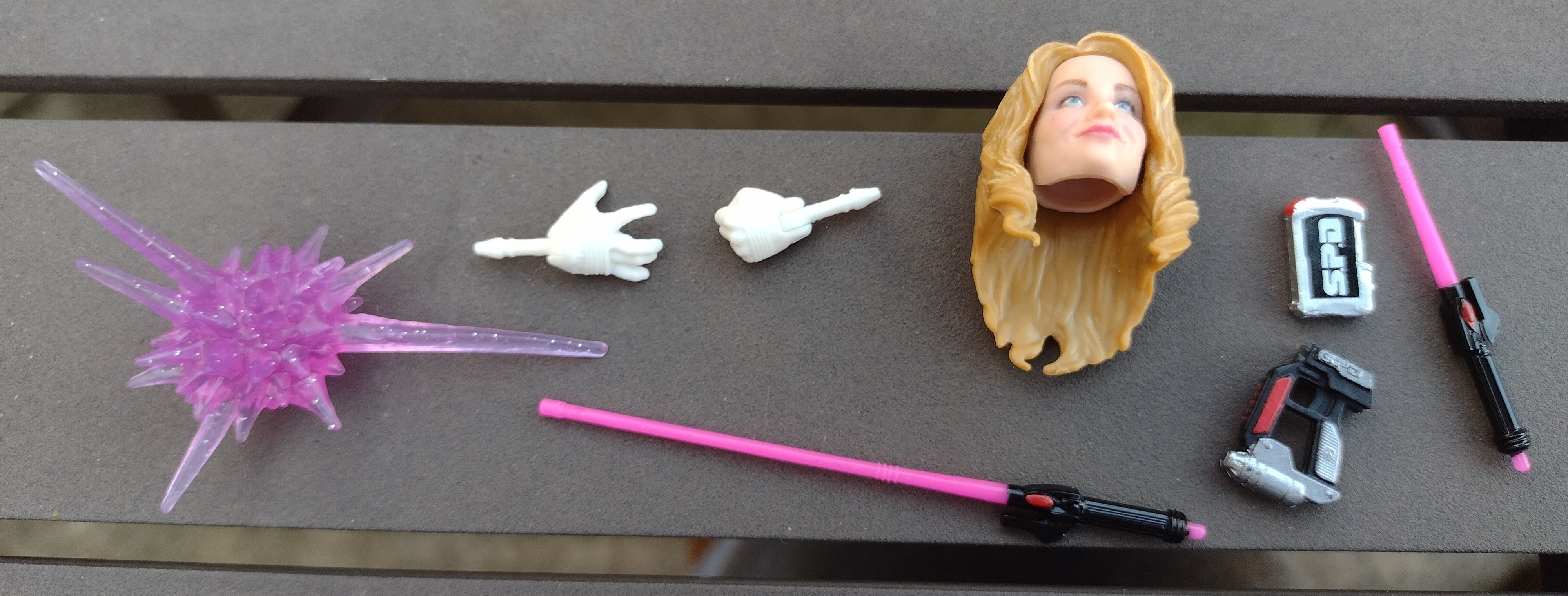 Here are her accessories, which consist of the pink effect piece (whose design was used in almost every wave since MMPR White's wave), a Delta Morpher-holding hand, a fist, a civilian head of Syd, a Delta Morpher (weirdly in silver rather than in white), a Deltamax Striker, a Deltamax Knuckle, and a shorter Striker for the gun mode.
