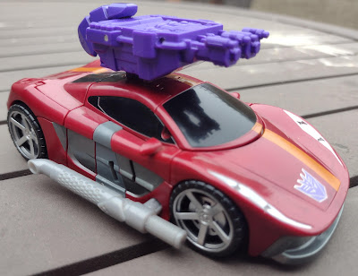 Here is Dead End in his vehicle mode. It's a very sleek design that takes him far away from the dated rectangles on wheels with the G1 toy into this fresh, bold car that screams attitude. Sure, it might not entirely fit his personality all that well, but to his credit, he deserves it a lot as a carformer. The deco used for the car consists of some nice silver for the rims and headlights, an orange stripe, a Decepticon insignia, gunmetal gray for the bumper and side doors, and black for the windows. It's apparently based on a Ferrari 458 Italia, which makes him feel closer to Dark of the Moon Dino than the Studio Series one does.