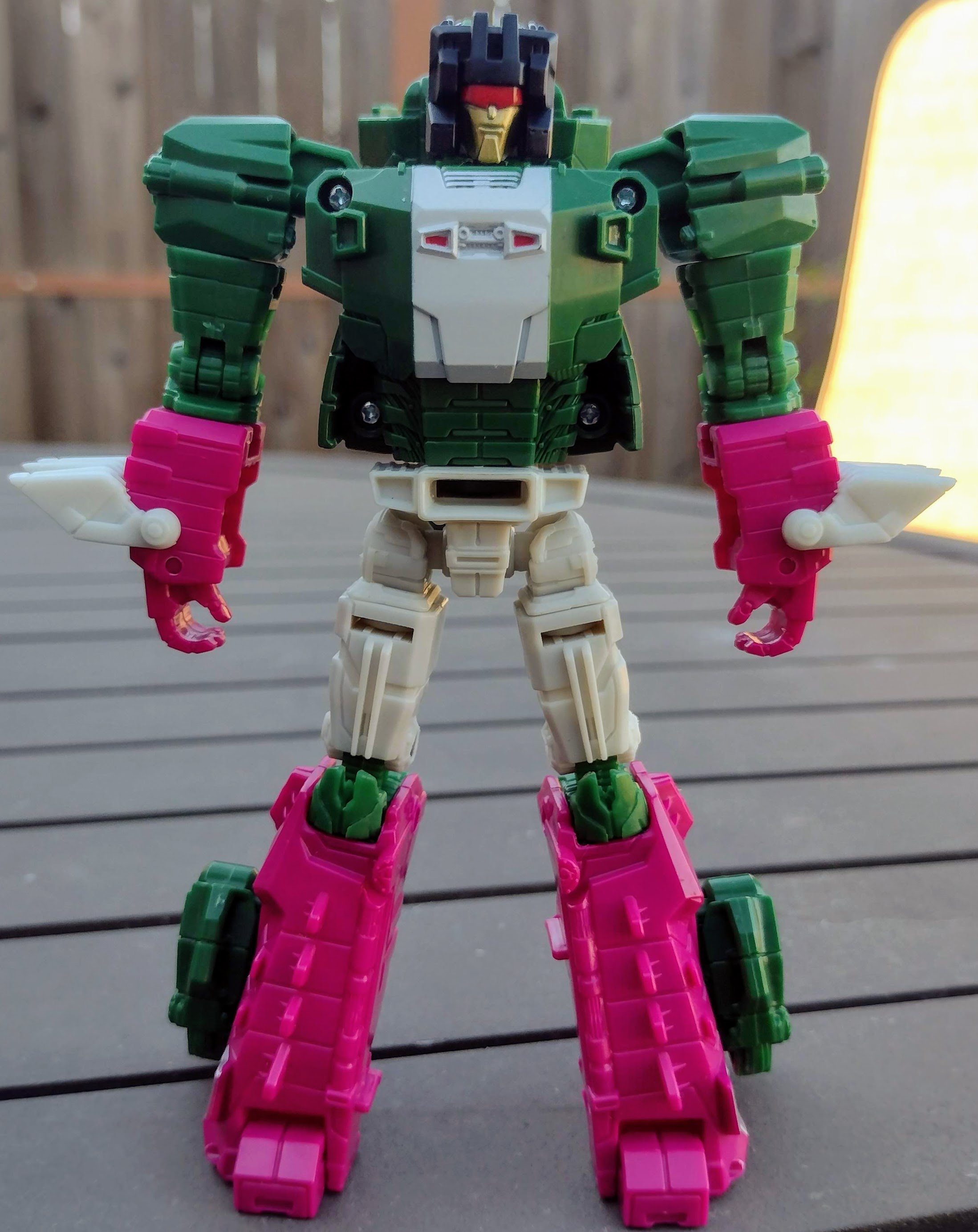 Transforming Skullcruncher is fairly easy, and it is similar to the way Weirdwolf transforms with forelegs becoming arms, tail partsforming, and the head goes on the back. At least his legs transform differently, but that's about it. The robot mode itself is perfectly fine, though now he looks like he's wearing gloves and lower boots in hot pink. I suppose the design is accurate to the character, but the bigger issues come from the lack of heel spurs. Because of how hollow the lower legs are combined with the big crocogater head, he's not an easy guy to have standing up. Weirdwolf at least had heels that were good to keep him standing. Also, while the white on his chest looks fine, it looks cheap on his claws and waist/thighs. And I see some other hollow parts I don't like.
