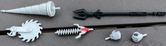 Here are all of his accessories,, consisting of his iconic staff, a massive drill, a saw blade, an auger, and two pairs of hands meant to hold the staff.