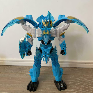 And now the Ptera Freeze Zord, which is a much more striking design in comparison. Apart from the icy color scheme, the robot design feels very regal, the wings look dynamic on the back, and the Ptera head on the chest looks like it can stab someone if they're not careful. He can have the right arm with his shield/gauntlet, which adds to the knight vibe present on his look. I think the white plastic has a pearlescent look to it which hopefully won't lead to yellowing compared to other white Hasbro toys.