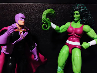 Here we have She-Hulk in hand. Wearing a simple yet effective purple leotard with a white belt to keep everything fit (along with matching wrist covers and boots), this She-Hulk serves as a perfectly classic interpretation, especially with a new body mold that captures her physique much better than prior versions of the character, at least in comic form. The musculature on the arms and thighs, combined with the 4-pack abs, all make for a well-sculpted figure one would hope She-Hulk would receive, all without being too petite or overly muscular on the Hulk side of the spectrum. The breasts may not look as well-sculpted as the rest of the toy, but not as annoying as the different shades of green used on the elbows and knee joints. This has been a common issue that Hasbro's Legends received of late for their pinless joints, so why is there no attempt towards fixing that? On a side note, the clothing is simply painted on, which makes sense for a budget approach with future repaints yet sucks that there isn't anything to make the skin feel separate from the outfit in some way.